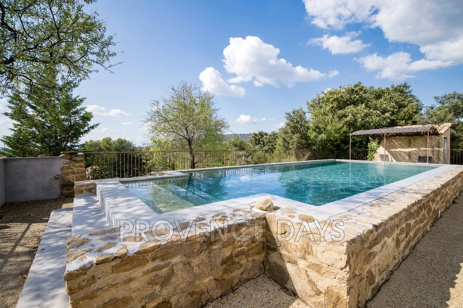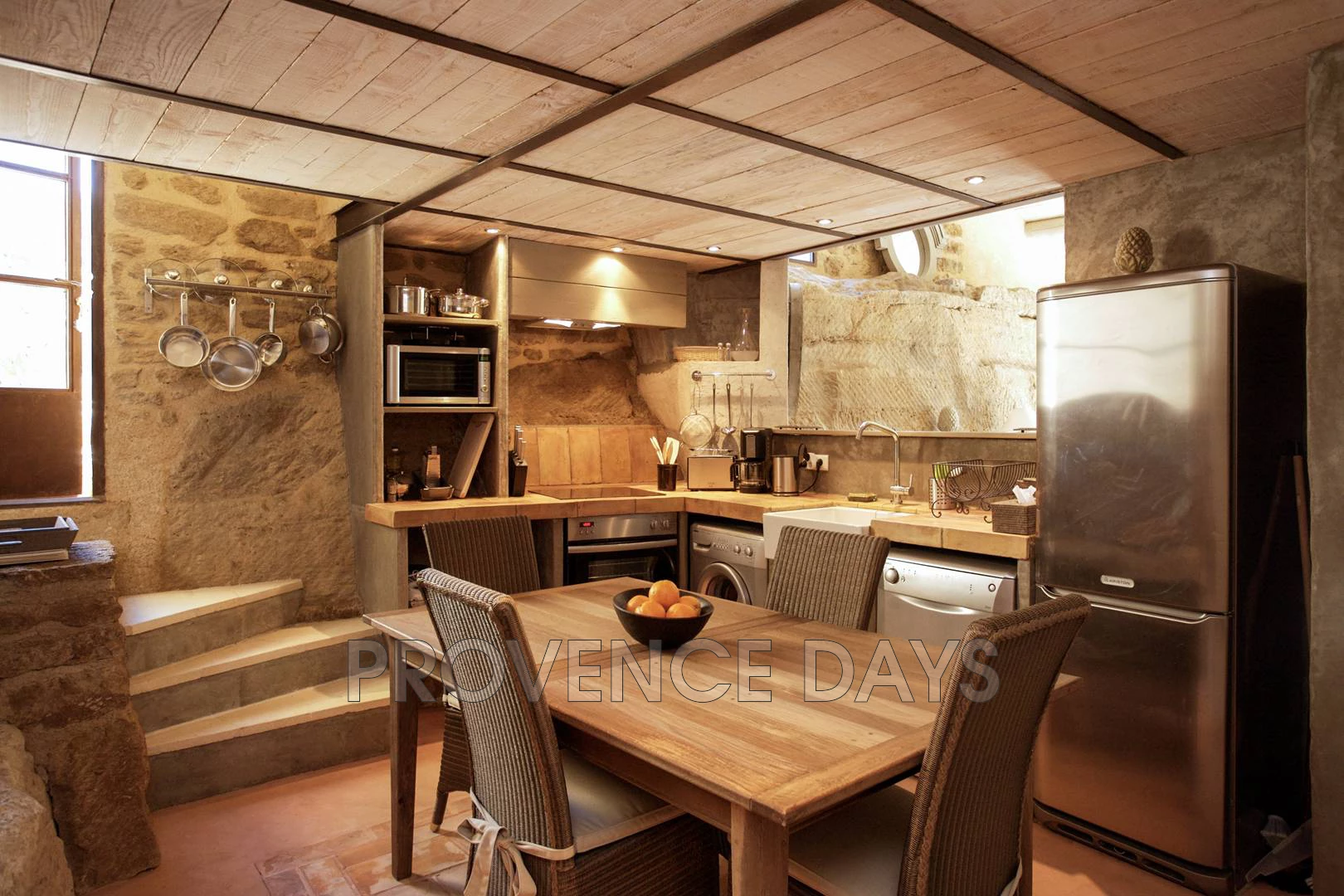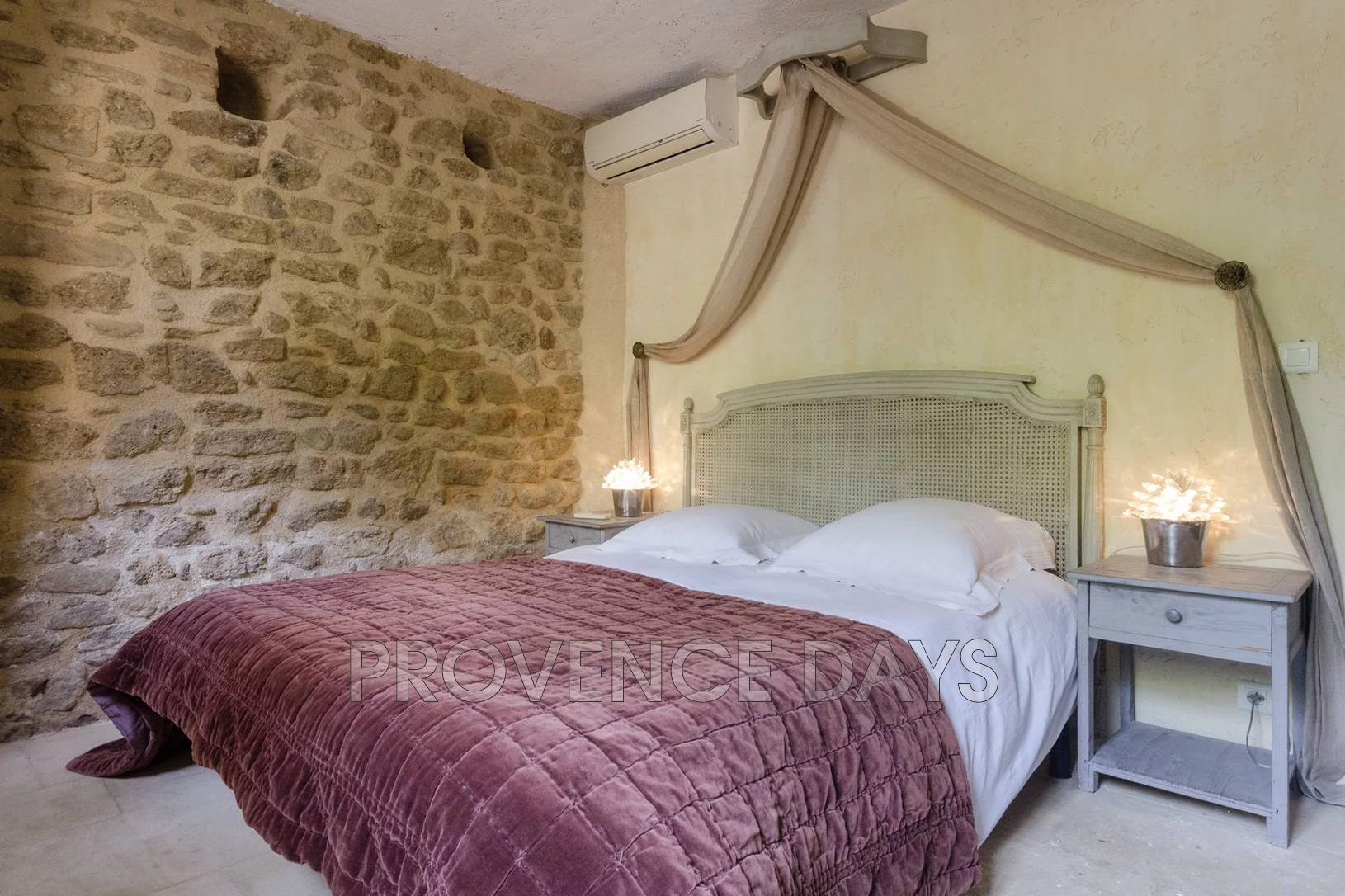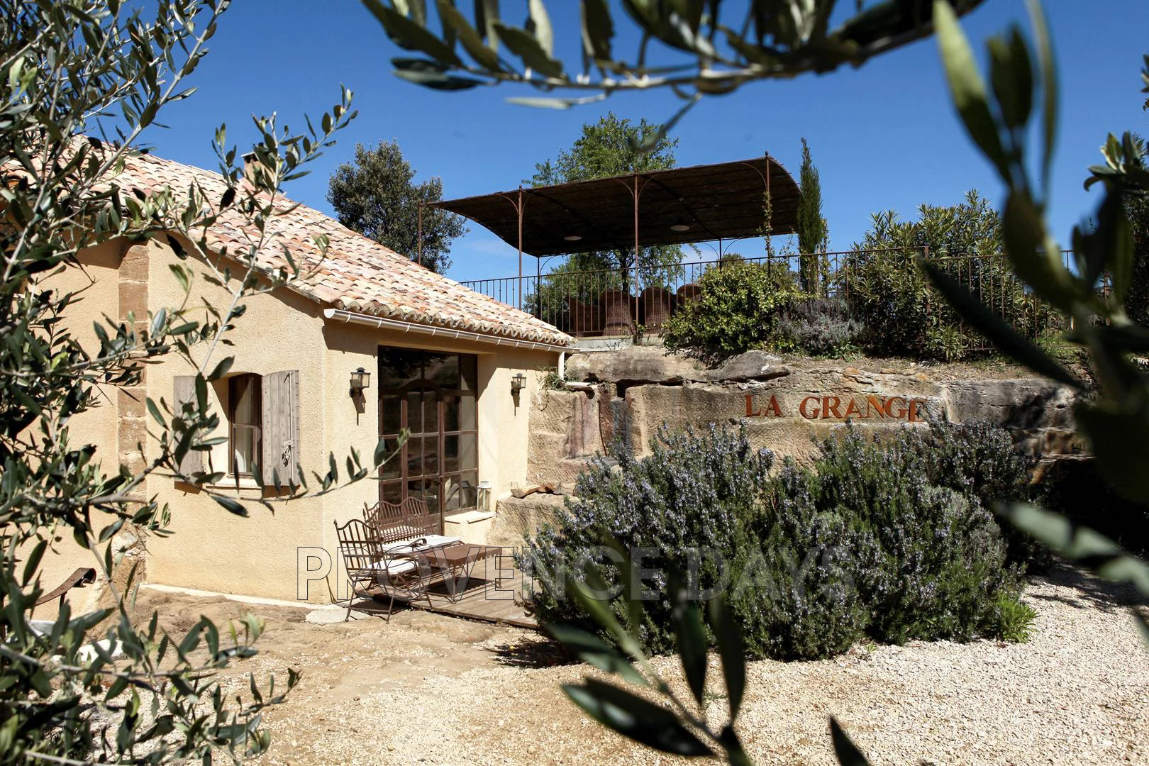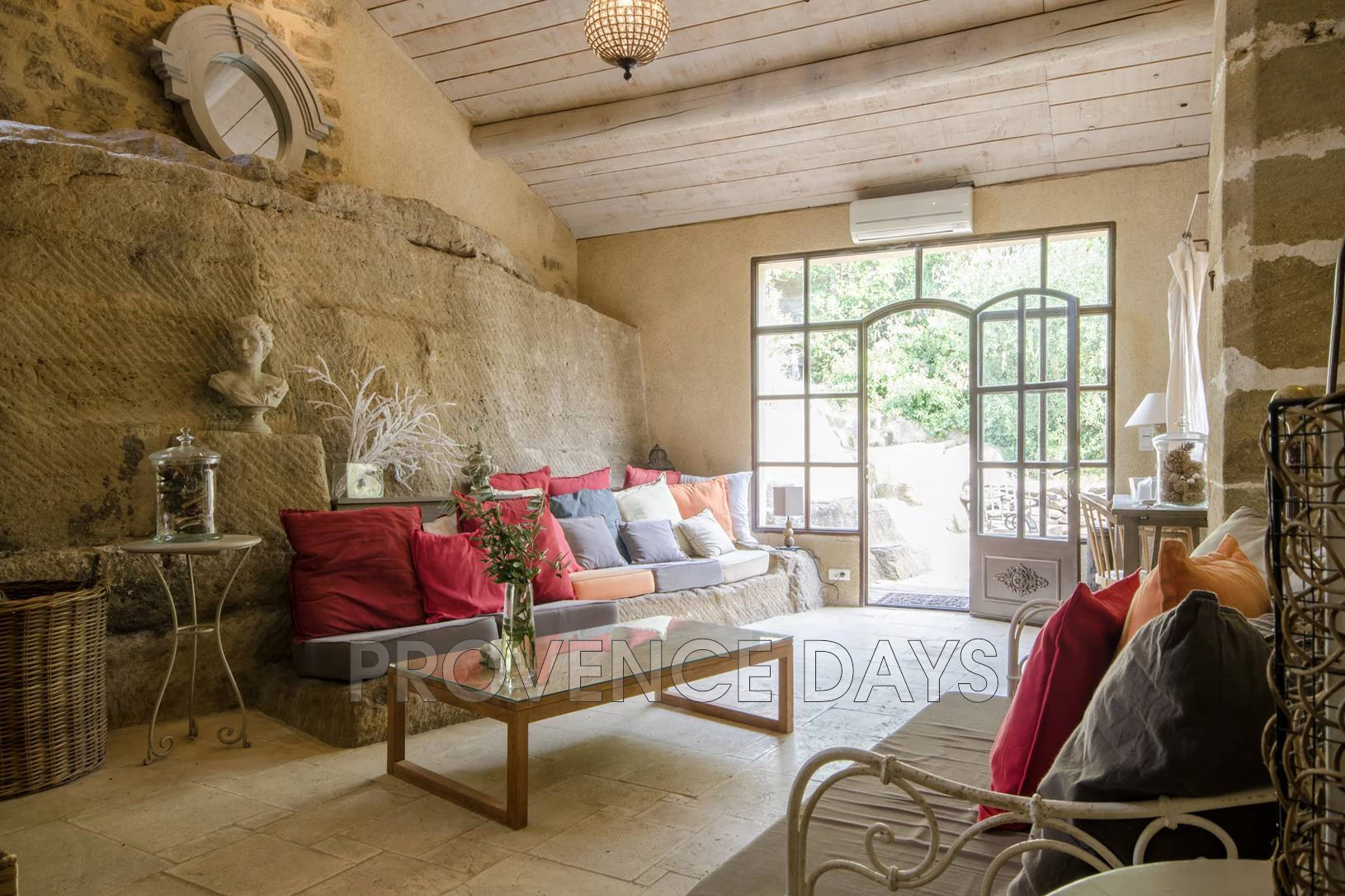 A chic barn conversion nestled among the vines. The house sleeps 8 - 10 people in 4 bedrooms with air conditioning throughout. The pool and shaded outdoor dining area are the perfect place to relax and take in the stunning countryside views. Located in Beaumes-de-Venise, an ideal base for wine touring and Mont Ventoux. - Inside - La Beaumes interior has appeared in design magazines, in particular its living room which is a large double-height space and built onto the rock that forms part of one wall. Also in this space are the kitchen and mezzanine level with TV den above. Off to the side of this main room are 4 bedrooms, 2 upstairs and 2 downstairs, sleeping 8 people (or up to 10 using the day beds on the mezzanine). The house is air-conditioned throughout. Living Room: Theatrical space with double-height ceiling, sofa and writing desk, and a fireplace. The living room opens out to the front terrace. Kitchen: With 3-ring induction stove, oven, large fridge-freezer with cold water dispenser, dishwasher, washing machine, microwave, coffee filter machine and Nespresso. TV den: On the mezzanine above the kitchen, with 2 single day beds, work desk, TV/DVD with French channels. - Bedrooms - The house has 4 air-conditioned bedrooms sleeping 8, with the possibility of 2 more children on the day beds on the mezzanine level. Two bedrooms and a bathroom are on the ground floor, and two bedrooms and a bathroom are upstairs. Bedroom 1: On the ground floor with two single canopy beds. Bedroom 2: Ground floor room opening out to front terrace with 1.6m/5.25ft-wide bed. Bathroom 1: The ground floor bathroom has shower, double basins and a separate WC. Bedroom 3: Upstairs room with 2 single beds. Bedroom 4: Upstairs room with 2 single beds. Bathroom 2: The upstairs bathroom has shower, double basins and a separate WC on the landing. - Outside - You step outside from the living room to the terrace in front of the house, with sitting area. Steps lead up to the rest of the garden which is on a raised level. Here the pool is fenced and gated for security and there is a shaded dining table with view of the Dentelles de Montmirail hills, and the vineyards of Beaumes-de-Venise. The pool measures 10m x 5m (32 x 16ft). Next to the pool are a lawned area and a plancha for outdoor cooking. The house has parking for several cars.