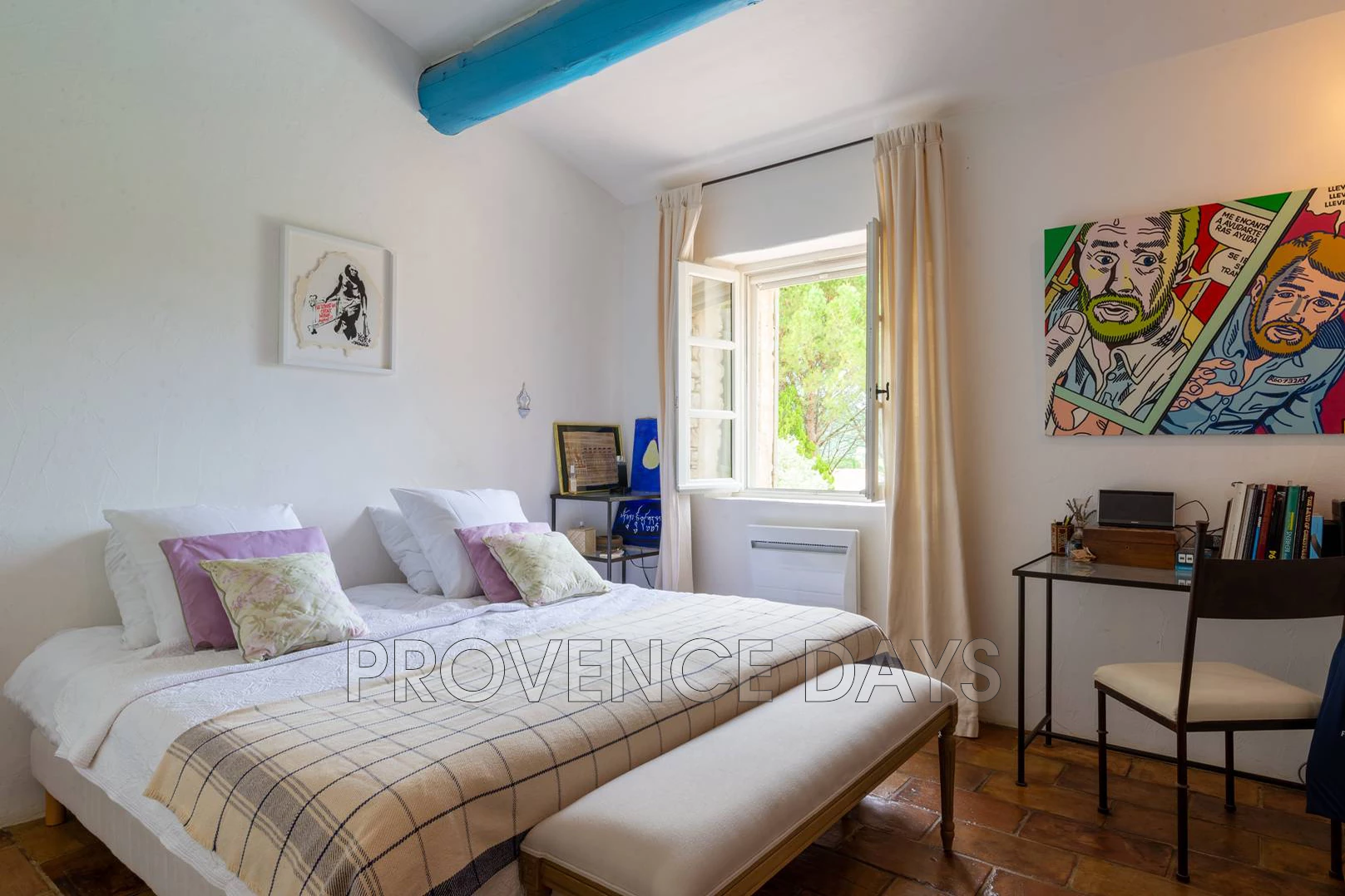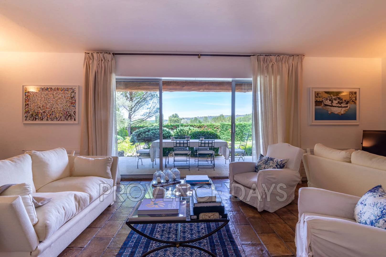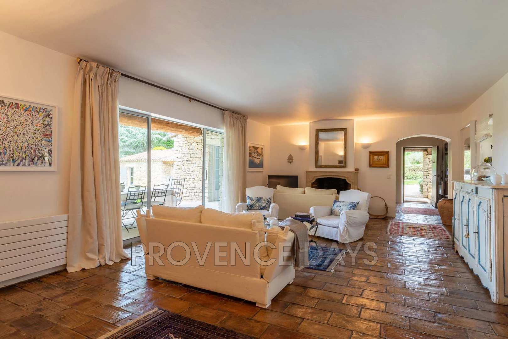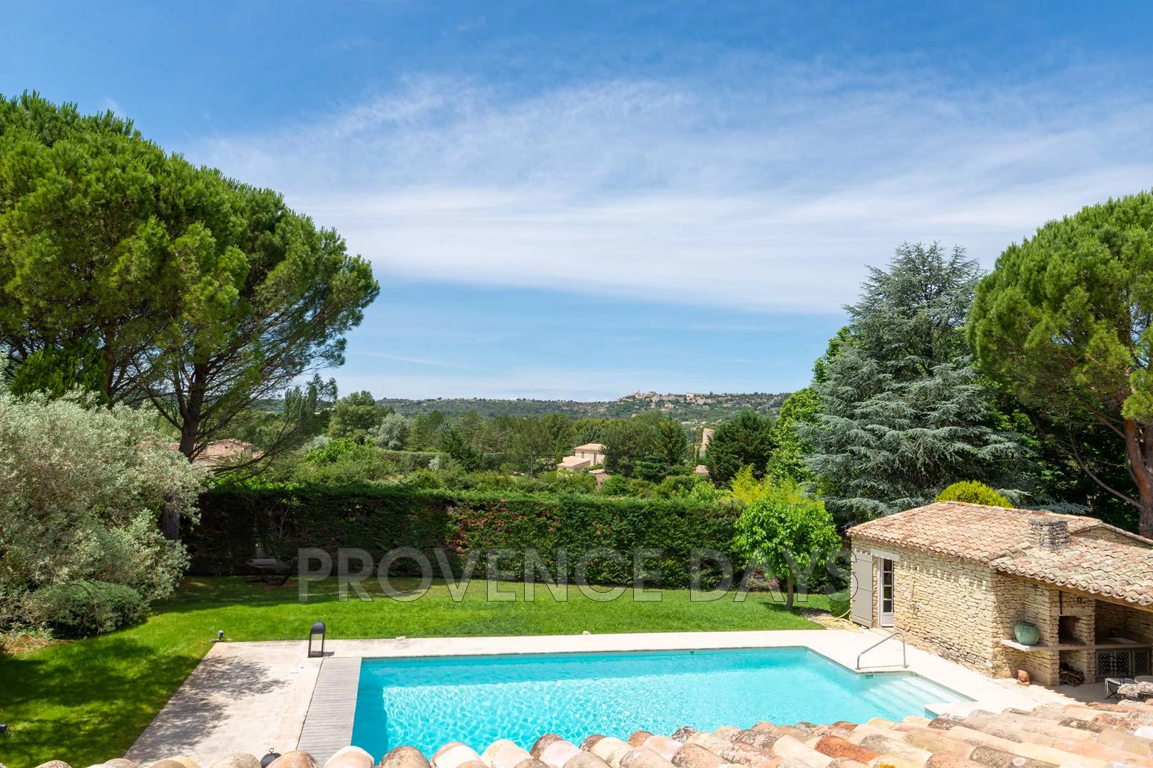 In the countryside near the famous, beautiful medieval village of Gordes you will find this peaceful haven. The sone built house has 3 bedrooms on two level with views to Gordes and delightful 12 m heated pool as well as a large 7,000m2 garden. - Inside Upon entering the house you have a view from the hallway all the through the Salon and on to the dining room at the other end of the house. From the Hallway you can choose to go through to the living rooms and kitchen, enter the ground floor bedroom suite or climb the stairs to the 2 bedrooms above. There is also a w.c. here. Living room: The heart of the house furnished with comfortable sofas and chairs, but it is the view through the patio windows through to the dining terrace, garden, pool and Gordes in the distance that grabs your attention. The living room also has a TV corner, fireplace and in common with the rest of the house there are many pieces of interesting artwork. Dining room: is accessed from the living room via an archway and provides a cosy dining space with a table for 6 and conveniently accessed by the kitchen the next room adjoining it Kitchen: is well equipped and is ideally placed for serving food to the dining room or directly outside to the dining terrace. The kitchen has an oven, electric ceramic hob, microwave, Nespresso (classic), toaster and mixer amongst its cooking appliances. To the rear of the kitchen is the Utility room. Utility room: has a fridge, freezer and washing machine. - Bedrooms - The house sleeps up to 6 people in 3 bedrooms. There is one ground floor bedroom with ensuite and 2 on the first floor with a shared bathroom. Ground Floor Master Bedroom: The bedroom is ideal for those not wishing to climb stairs and is off the entrance hallway, there is a 1.80m bed / 2 singles. It has an ensuite bathroom with access to the terrace and views onto the garden. Ensuite Bathroom: There is a bath with shower above, bidet and sink. Downstairs w.c.: In the hallway there is a separate w.c. First Floor Bedroom 2: With a 1.80m bed / 2 singles and view to the garden and Gordes, there is a desk and chair and plenty of built-in storage. Bedroom 3: With a 1.80m bed / 2 singles and view to the garden and Gordes, there is a desk and chair and plenty of built-in storage. Bathroom: There is a bath with shower above, bidet and double sink. This bathroom is for bedrooms 2 and 3. Upstairs w.c. : Separate w.c. for upstairs bedrooms. - Outside - The large beautifully kept gardens and grounds have something for everyone: There is relaxation around the 12m + heated pool, A play area for young kids, and plenty of gardens to explore and play, there is even lots of gravel pathway for a fun game of boules. Stepping out from the house you have a dining terrace that commands a view over the pool, and on towards Gordes. There is a pool house next to the pool with a shaded dining area and outdoor lounge furniture. There is also a BBQ that can be used in the summer kitchen area. There is a play area for smaller children below the fruit garden, and here you will find plenty of space to play games or have a quiet moment away from the house. You arrive through secured gates and there is amble parking that is set beneath shading trees.