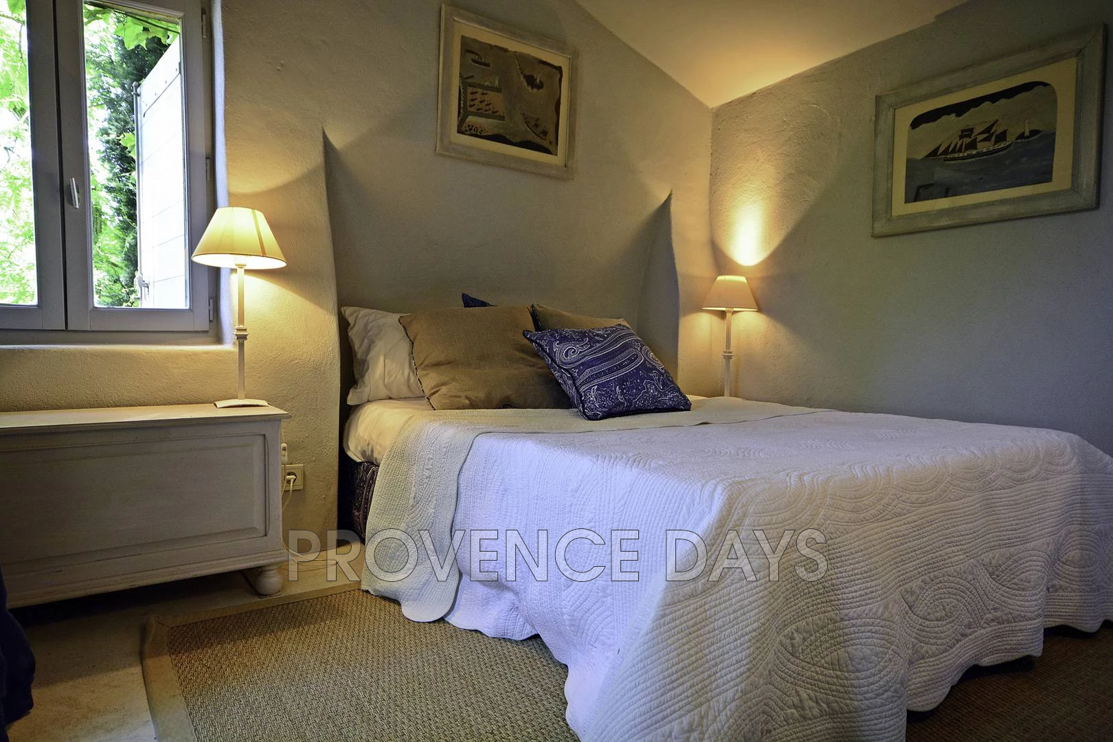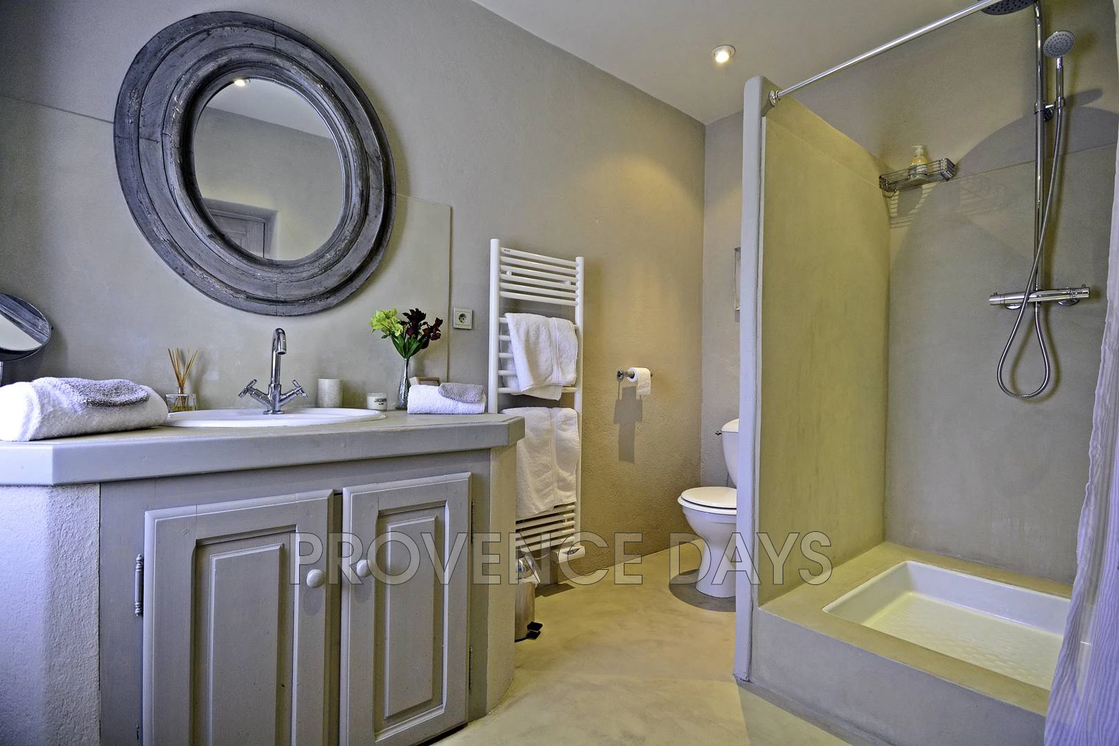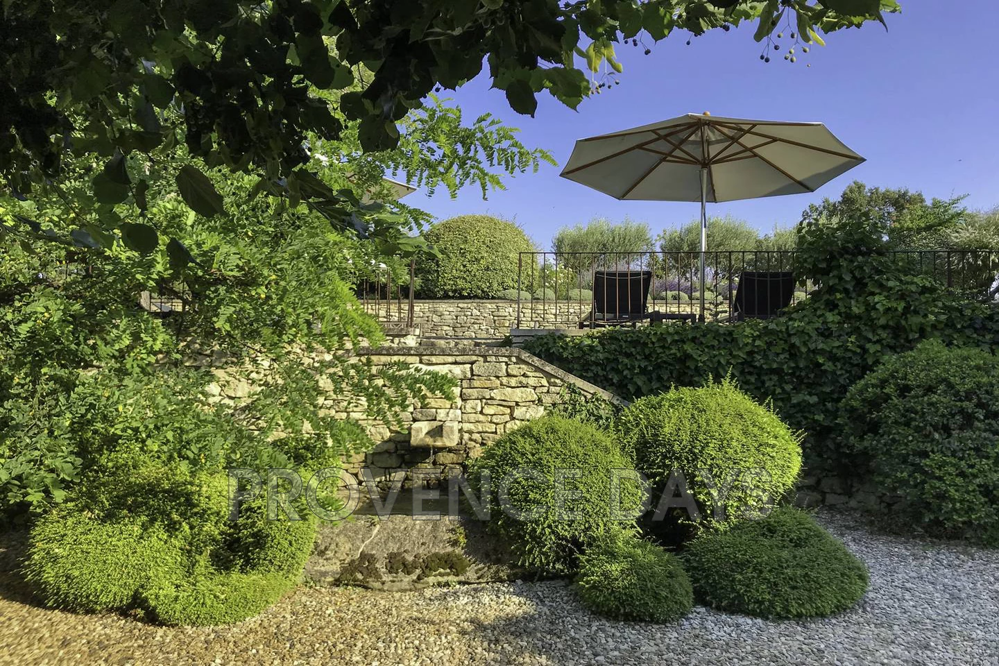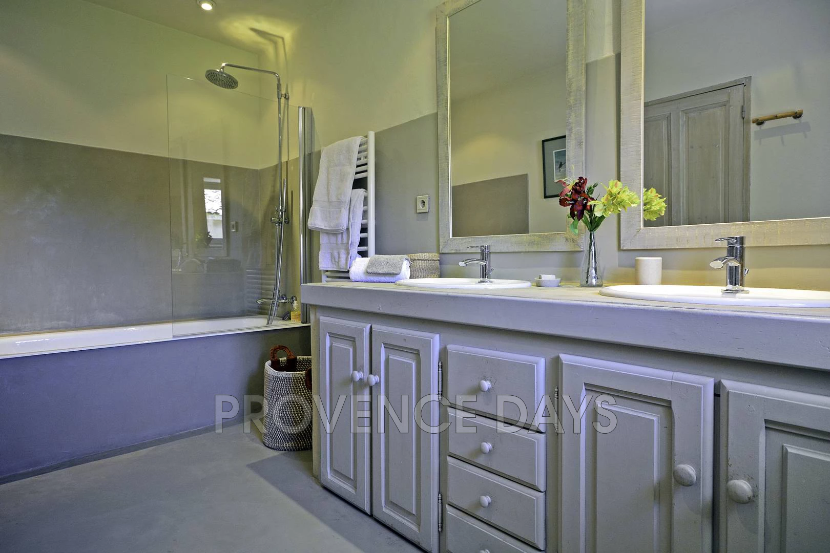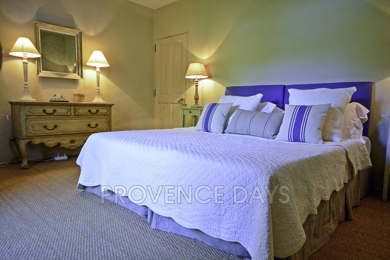 The impressive Mas les Tour Ouest is a beautifully renovated French farmhouse, sleeping 12 people, with comfort and relaxation easily catered for. The house is generously proportioned being 300m2 spread over 2 levels. The grounds ate extensive with sculpted gardens, a large heated pool and views to the Luberon hills. - Inside - You enter the courtyard and enter into a central hallway. Snug: From the courtyard the main entrance opens to a central hallway. To the left you come to a welcoming and calming area with vaulted ceiling, open fireplace and comfortable chairs. Kitchen: Leading on from the snug you find a true chefs kitchen again with a wonderful vaulted ceiling. The kitchen is well equipped with LaCanche range stove, a 3m long central island, large stone sink, and work tops along the side. Equipped with fridge freezer, dishwasher and air-conditioning. The kitchen allows easy access outside to the rear of the house. Dining Area: At the back of the kitchen is a round dining table with seating for 10 and from here you can walk through to the sitting room. Utility: Housed here is a second fridge freezer and guest w.c. Sitting Room: A large room housing four comfortable sofas a log burning stove and TV corner. Light floods in from the door and windows to courtyard side and from the large French doors leading to the wonderful west terrace. Laundry: Behind the sitting room there is a laundry room with a washer and dryer. - Bedrooms - The house sleeps 12 people in 6 bedrooms, with 5 bathrooms. Three are 4 bedrooms on the first floor, one of which is a family suite (childrens room accessible through parent room). One bedroom is on the ground floor and an extra one in the Pigeonnier across the courtyard. First floor: Master bedroom 1: with king sized four poster bed (180 cm) and ensuite bathroom. The room has air conditioning and doors open onto a juliet balcony overlooking the courtyard. Bedroom 2: King size bed (180 cm, can be made up as twins) with ensuite shower room and views to the courtyard. Bedroom 3: Family suite with queen size bed with an ensuite bathroom and door to. Bedroom 4: With twin beds (suitable for children) with window views to fields. Ground floor: Bedroom 5: super king size bed (180 cm) with ensuite shower room and views to the courtyard. Pigeonnier: Across the courtyard is a small tower and inside are a flight of stairs up to a bedroom with a l double bed (140cm) that opens out directly onto the swimming pool terrace. On the lower floor there is a with shower room and separate toilet. - Outside - You arrive along a private road to the house and have a shaded parking in area. From here you enter the courtyard with is delightful trickling fountain and welcoming verdant shade giving access to the 12m x 6m heated pool that looks over the house. The house sits on 1.5ha of land giving privacy and plenty of places to explore and play for. On the west side of the house adjoining the sitting room is a dining terrace and a shaded lounge area, set against the beautifully sculpted topiary garden with views out to the Luberon hills and village of Goult. Ideally placed in this area is a boules court There is another outdoor dining option in the courtyard under a shading wisteria vine.