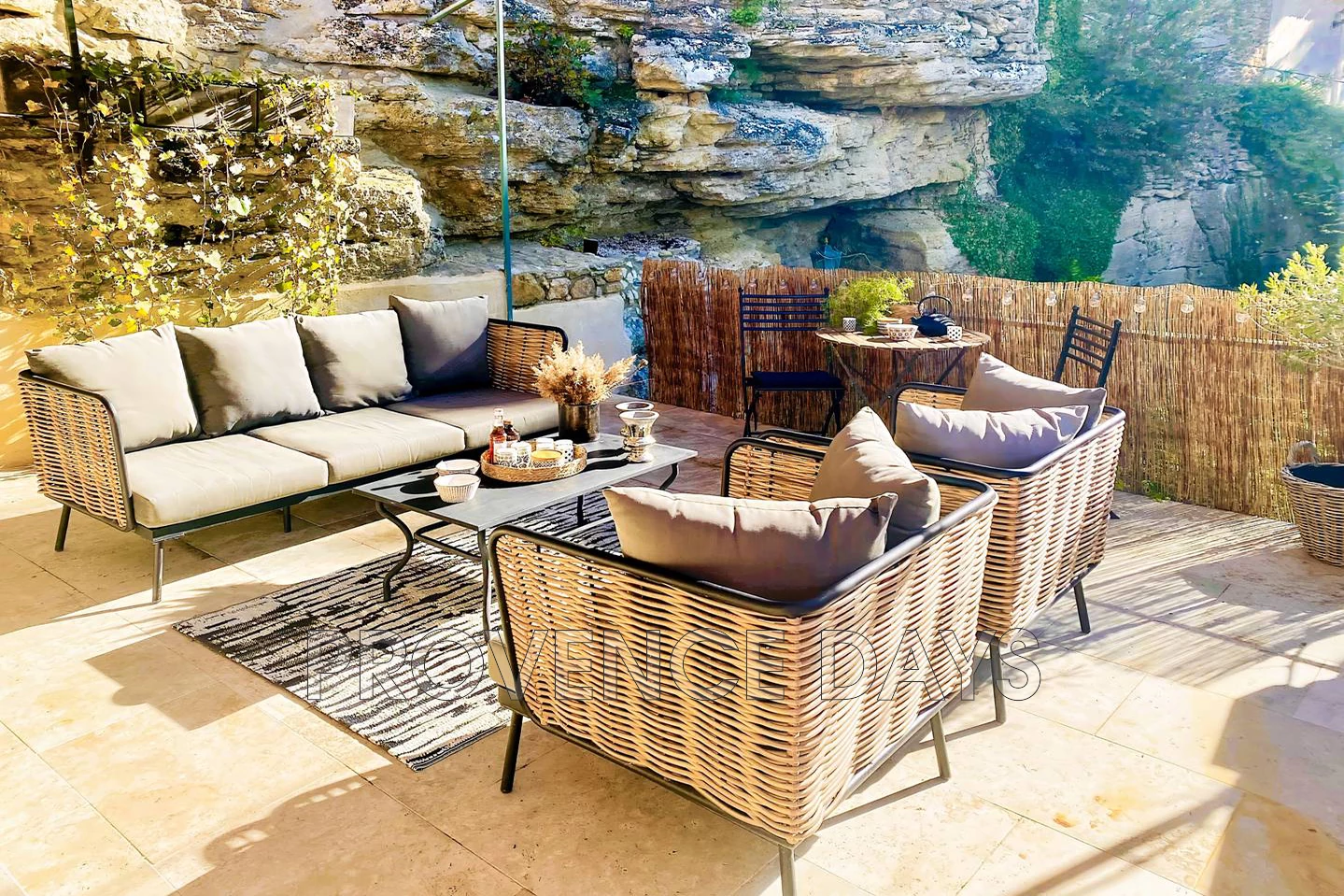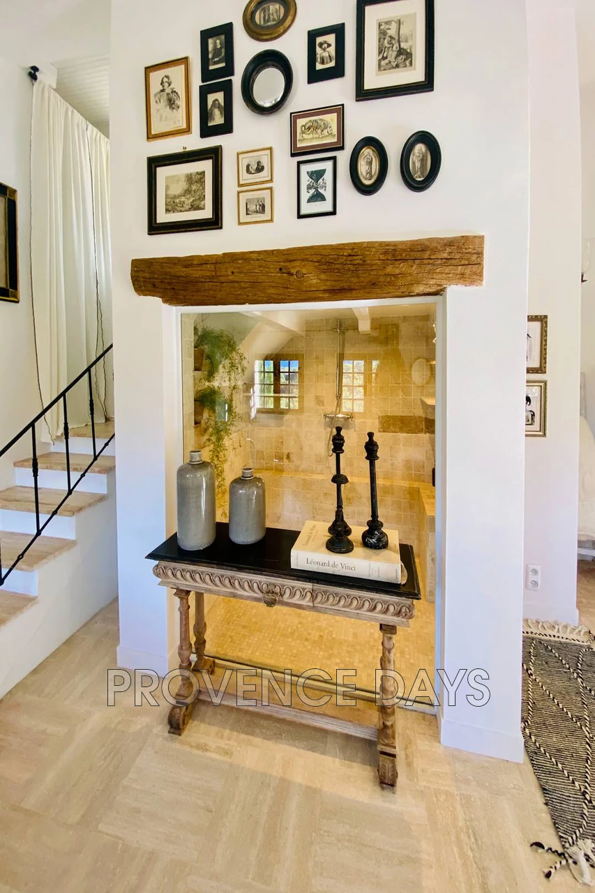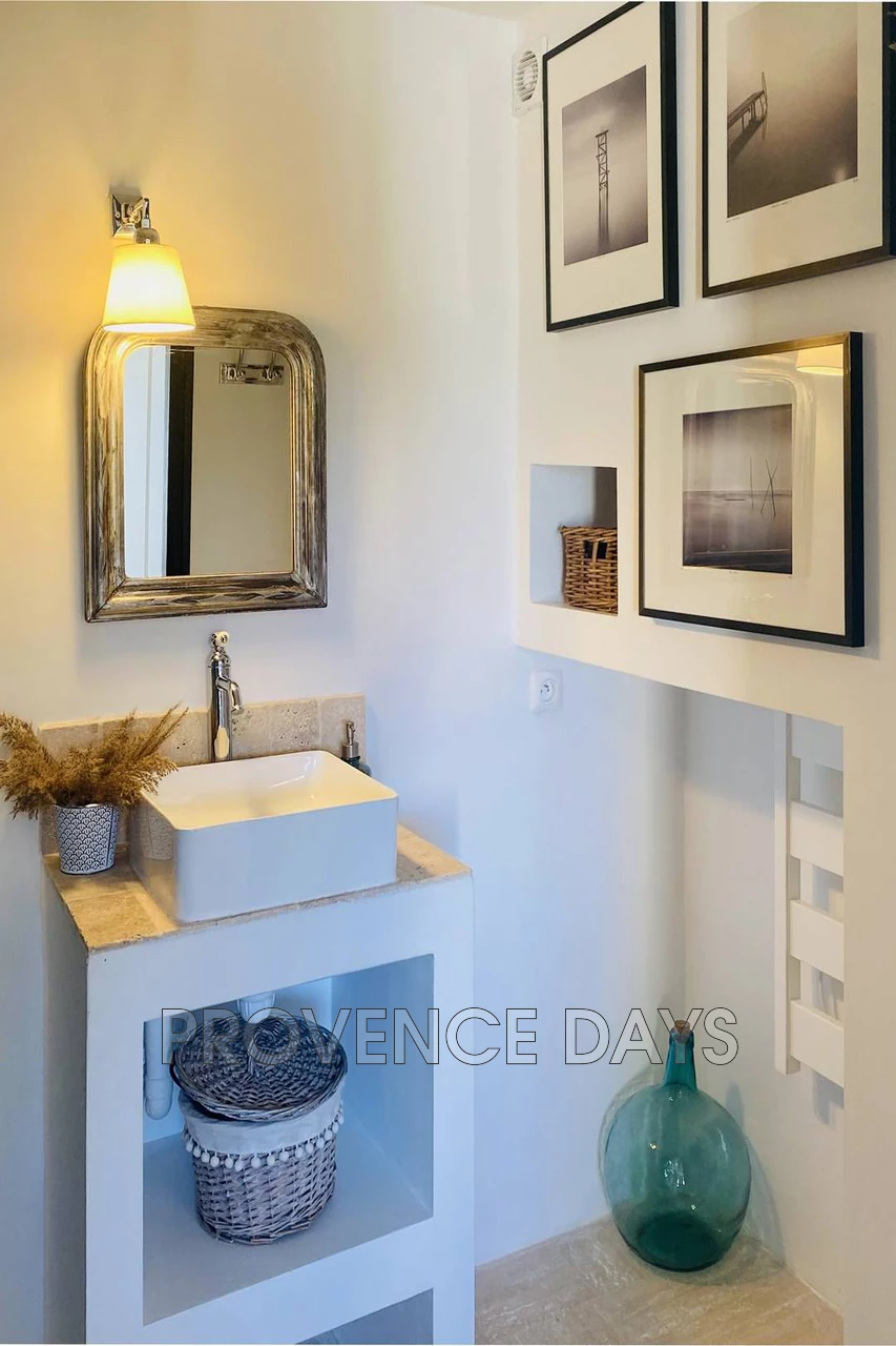 The house sits just above the village of Menerbes, in a quiet street leading to the countryside but within just a minute of all that Menerbes has to offer. This is a delightful 3-bedroom house has been renovated with an eye for comfort and an eclectic style. - Inside - Set on 3 floors the house at the ground level has an open plan living room, dining area and kitchen, off the hallway is an entertainment room. On the second floor are two bedrooms, accessed from the living room, and the grand third bedroom is on the third floor and is accessed from stairs in the garden. Living room area: With views onto the garden through the spectacular patio doors there is sitting area with 4 comfortable chairs and a low table next to a fireplace. Dining room area: A large wooden table seats 6 or more people again with views to the garden and front of the house Kitchen: The kitchen is unusual in that it has been built into the marvelous rockface and the stone gives the room a wonderful ambiance. The kitchen is well equipped with an induction stove, oven, dishwasher, fridge, and a washer-dryer. . Entertainment room: Featuring two sumptuous chaise-longe style sofas and a large smart TV this comfortable space is an ideal relaxing room. Off this room is a bathroom with a wc Guest WC: The guest WC is on the ground floor. - Bedrooms - The house sleeps 6 people with 2 bedrooms on the second floor accessed from stairs in the living room area, and 1 bedroom on the third floor accessed from stairs in the garden, and three bathrooms. Bedroom 1: A double room with a 1.6m/5.25ft-wide bed and en suite bathroom with shower, basin, views to the front of the house and across the village Bedroom 2: A room with two single beds and en suite bathroom with shower, basin, views to the front of the house and across the village Bedroom 3: This room is spread out across the entire third floor and includes the upper terrace that is accessed via a wall of patio doors and windows. The bed is a 1.8/6ft king-size bed, there are two comfortable seating areas and a fireplace. There is a fabulous walk-in shower with a floor to ceiling glass window to let in light and a view of the room whilst you shower Stairs lead up to a room with a wc and basin - Outside - The garden consists of several levels framed by the beautiful rock face that walls one side of the garden. You begin at the dining terrace outside the kitchen, here there is a dining table and BBQ shaded by a pergola with a climbing vine. From here you can see the beautiful and inviting 2m x 2.2m dipping pool, with its glass front, perfect for cooling off on hot days. Next to the pool you can take a sunlounger and relax at the pool side in the sun or shade. A set of stairs leads you up to a terrace which leads to the magnificent bedroom 3. This terrace has a view across the village and countryside with relaxing seating to take it all in The house has an off-street parking spot, and is situated at the end of a small road used only by residents, so it is very quiet.