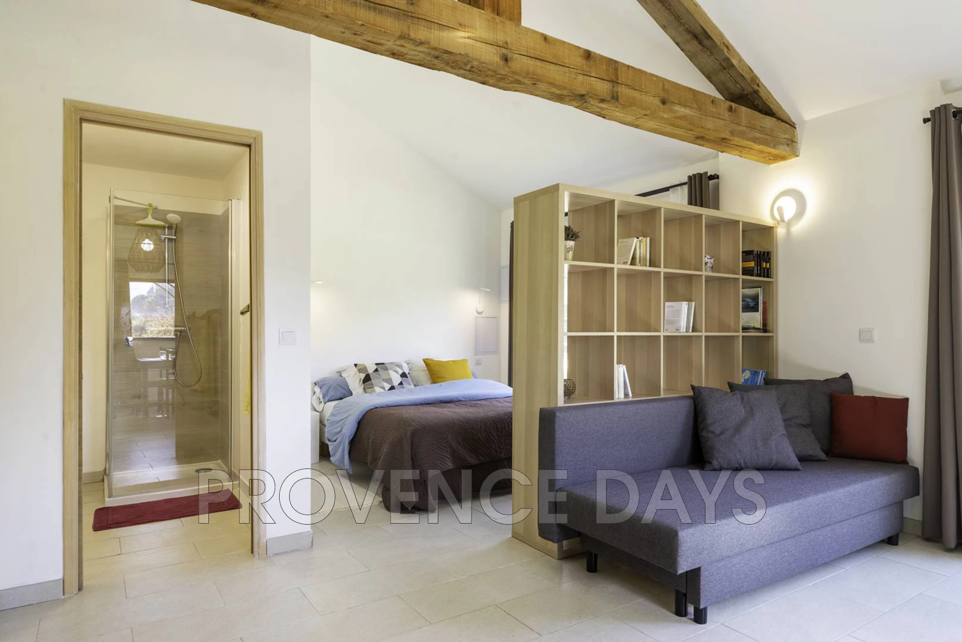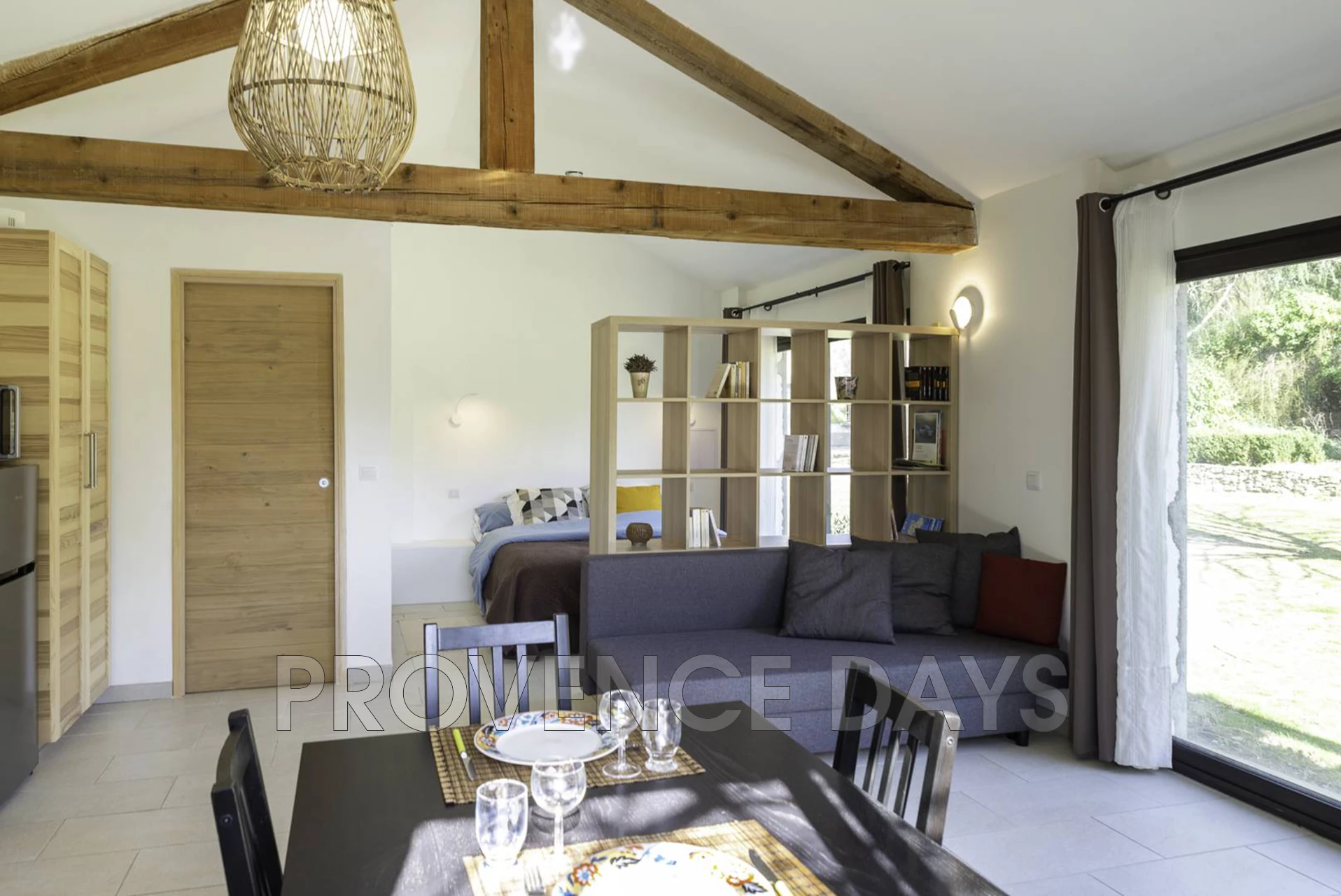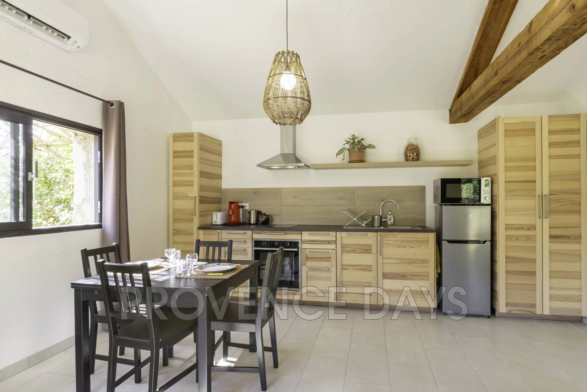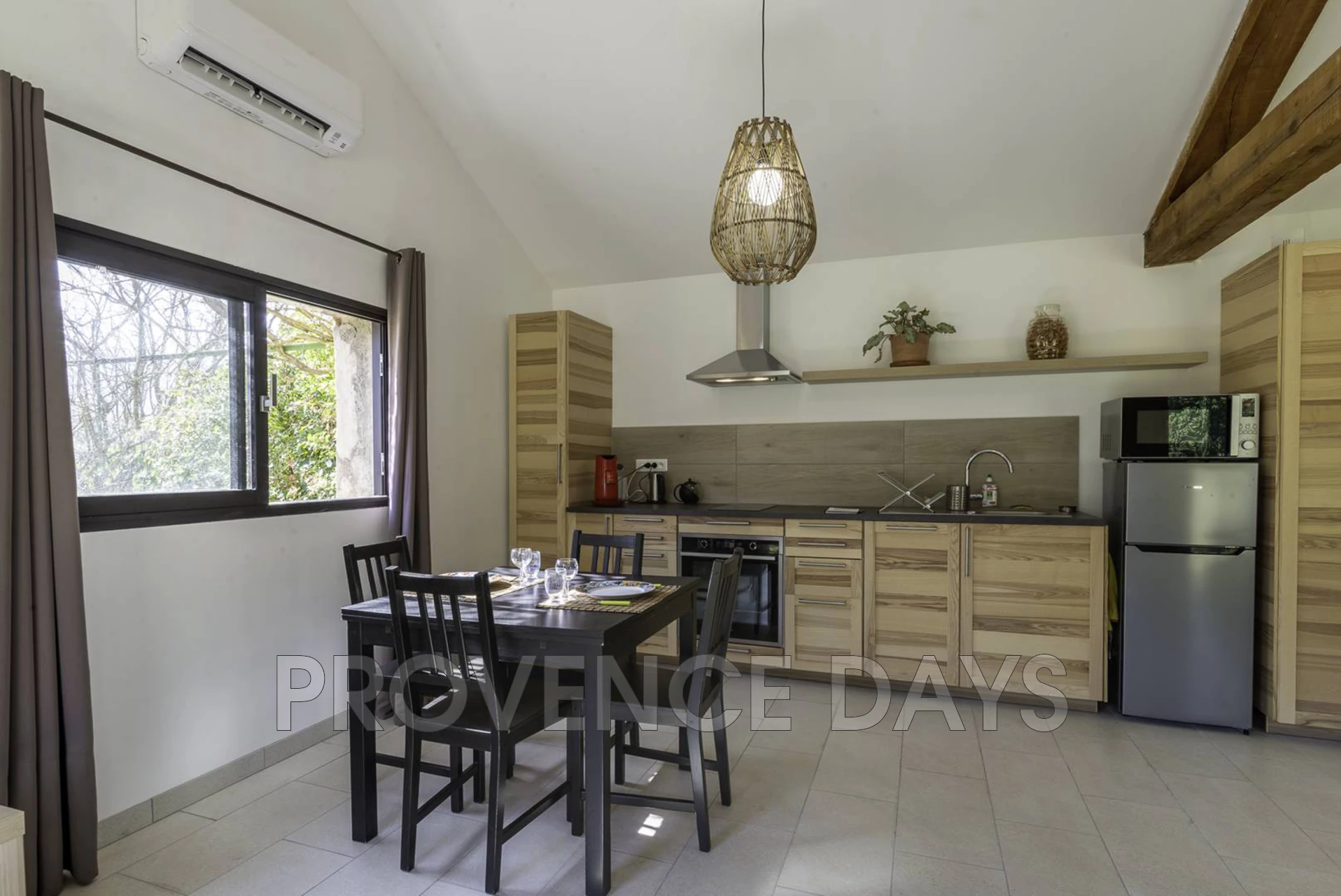 This beautiful air-conditioned space is bright and airy thanks to its 2 bay windows overlooking the large garden and feels spacious with its beautiful high ceiling. Ideal for a couple, it will be the perfect starting point to discover the Luberon and its medieval villages and cities or for simply taking it easy and relaxing. - Inside - A lounge area with sofa, coffee table, television and WIFI, The open kitchen is spacious, with 2 induction hobs, an oven, dishwasher, refrigerator, coffee maker, kettle, and toaster. A table for 4 people allows you to dine inside. The sleeping area is separated from the rest of the house by a beautiful bookcase and includes a double bed (160cm), two bedside tables, and wall lamps. The large shower room is enclosed and has a w.c., large washbasin with storage unit, shelf, and walk-in shower. - Outside There is a shaded pergola to host lunches and dinners in summer, equipped with two deck chairs for a moment of relaxation with a view of the Luberon. An outdoor kitchen is also at your disposal under a large shaded awning, equipped with a barbecue. Finally, you will have access to the large swimming pool 6 x12m, open from May to September, surrounded by a beautiful terrace equipped with sunbeds, in the middle of lavender and rosemary trees, A ping pong table and a boules court are also at your disposal. There is also plenty of room to park your car near to the apartment. The appartment has its own private terrace but the gardens and pool are shared with the owner.