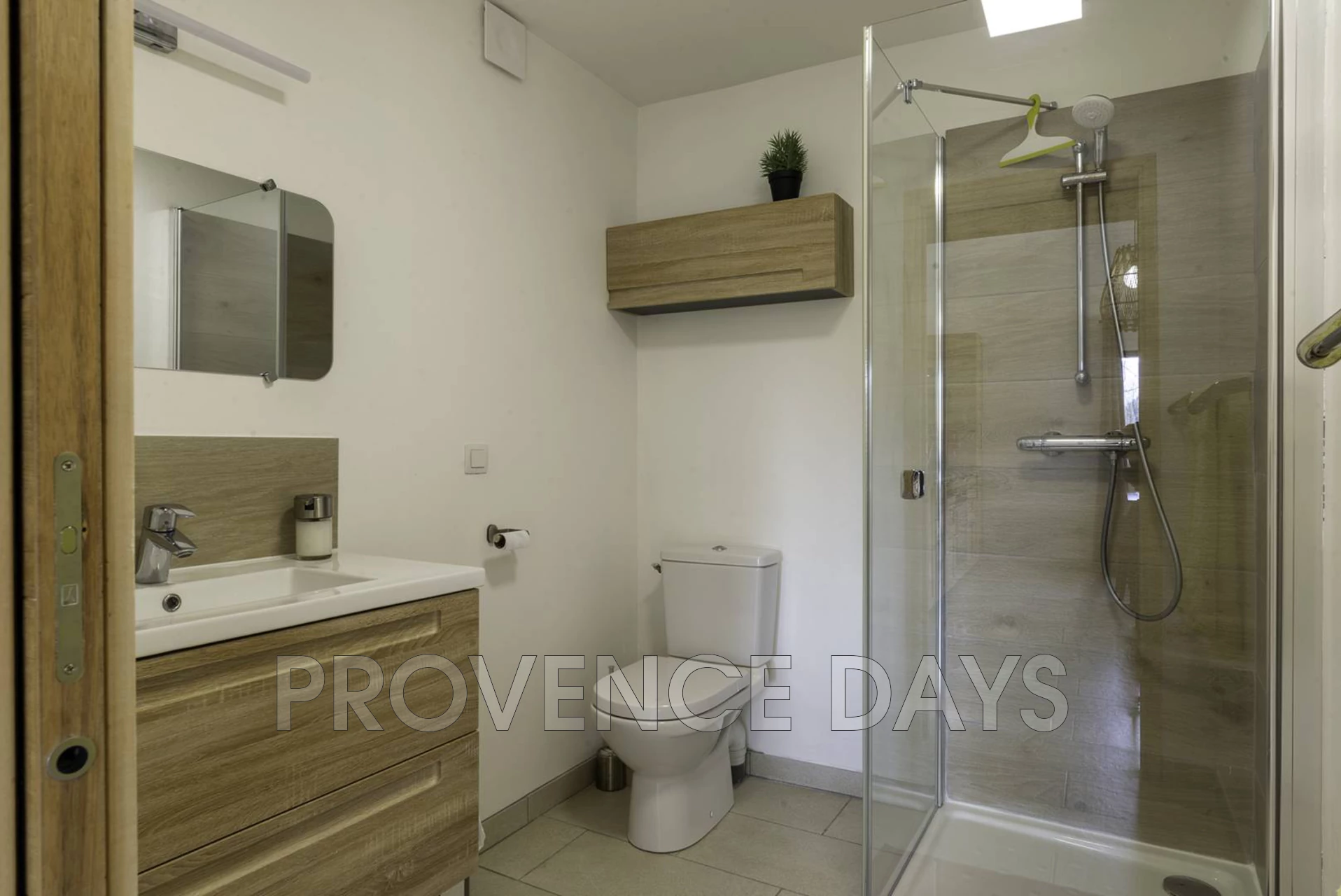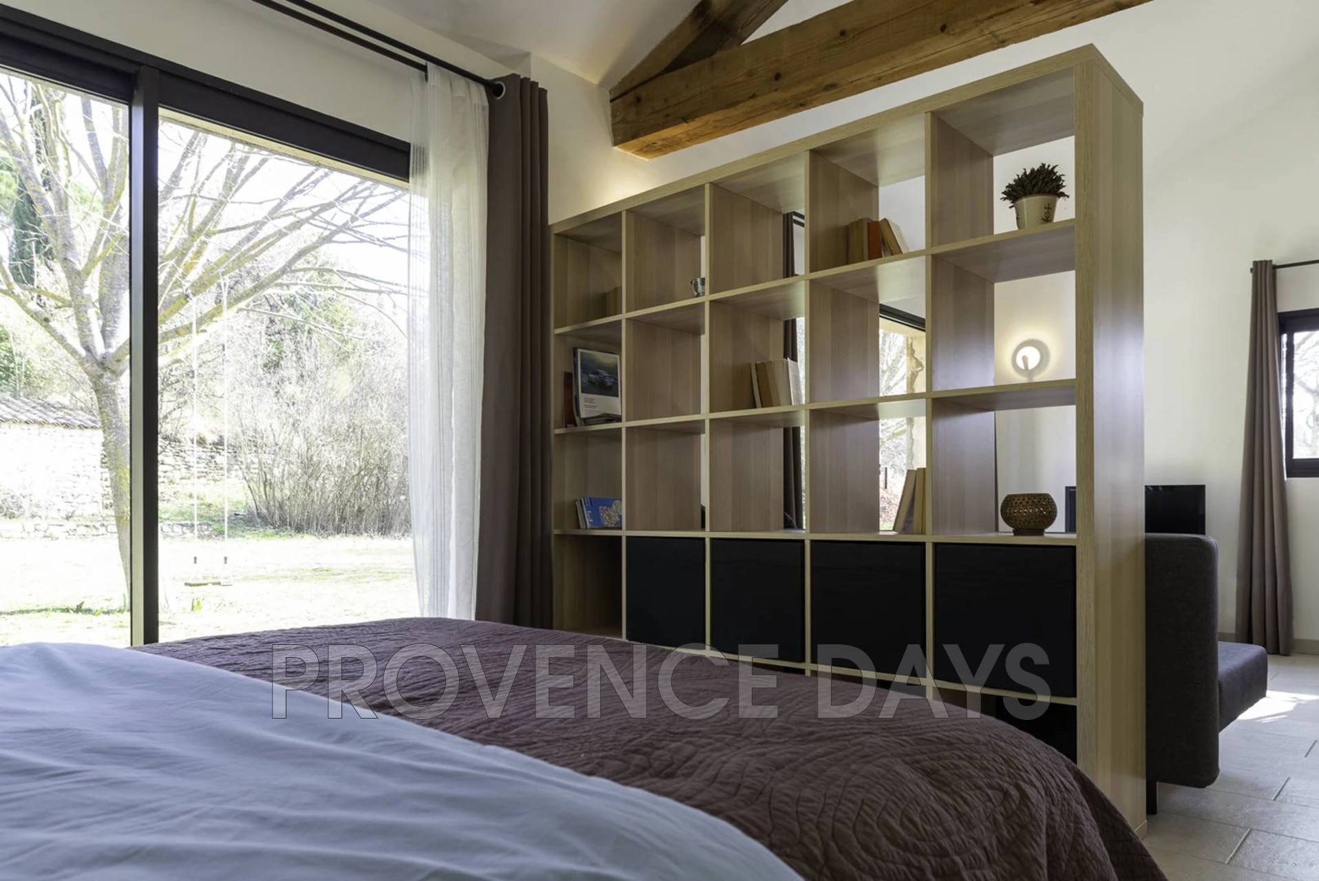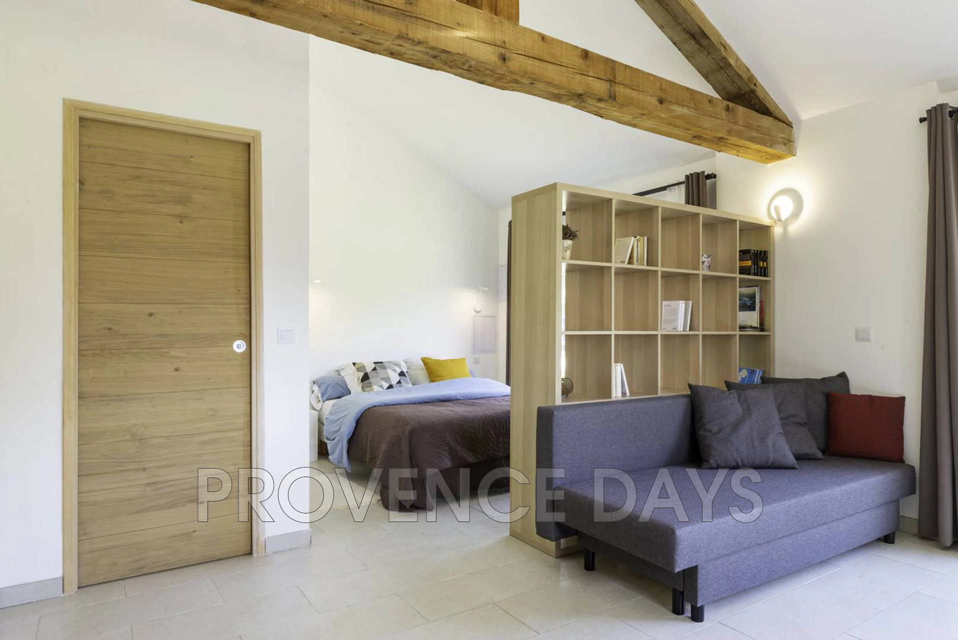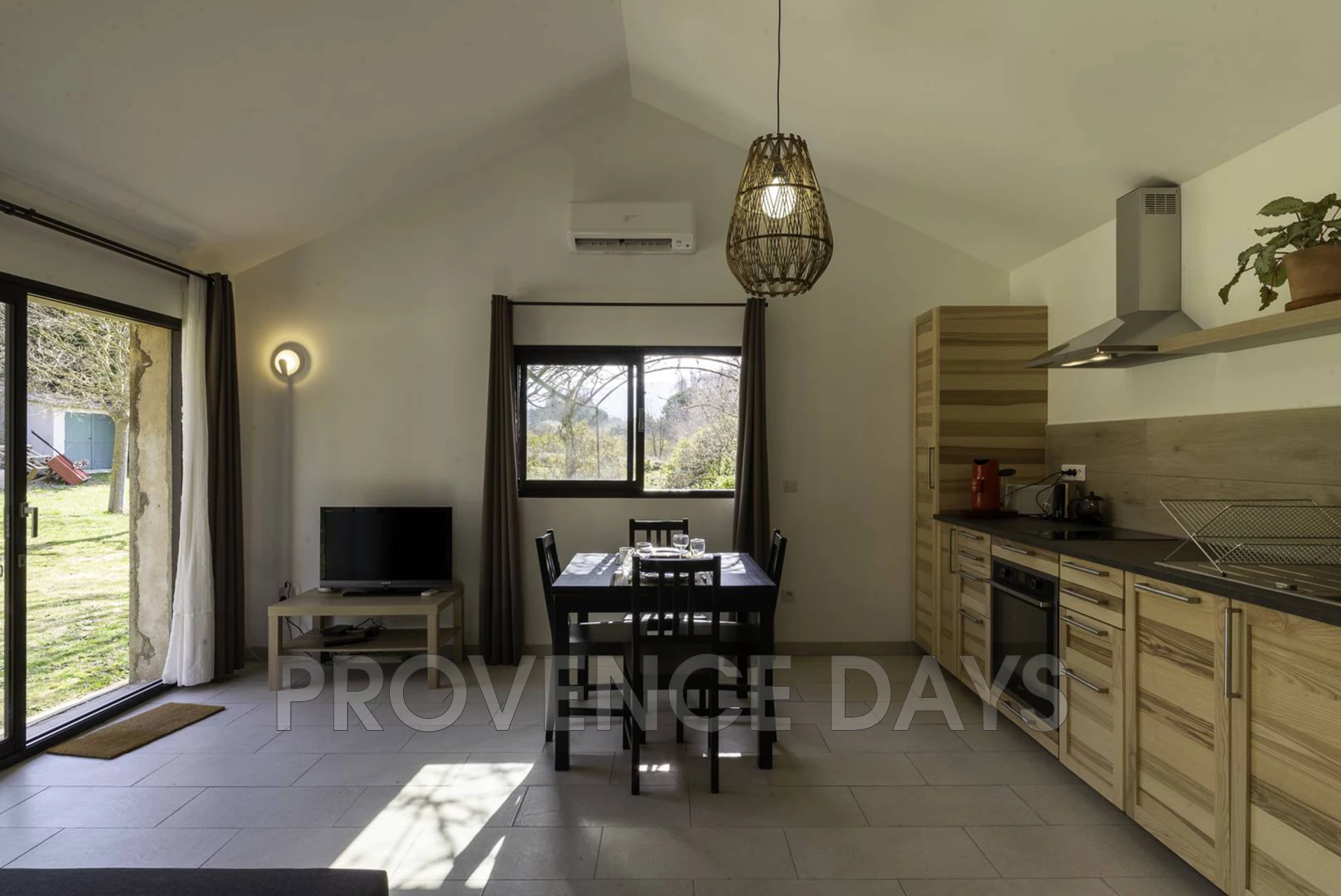 This beautiful air-conditioned space is bright and airy thanks to its 2 bay windows overlooking the large garden and feels spacious with its beautiful high ceiling. Ideal for a couple, it will be the perfect starting point to discover the Luberon and its medieval villages and cities or for simply taking it easy and relaxing. - Inside - A lounge area with sofa, coffee table, television and WIFI, The open kitchen is spacious, with 2 induction hobs, an oven, dishwasher, refrigerator, coffee maker, kettle, and toaster. A table for 4 people allows you to dine inside. The sleeping area is separated from the rest of the house by a beautiful bookcase and includes a double bed (160cm), two bedside tables, and wall lamps. The large shower room is enclosed and has a w.c., large washbasin with storage unit, shelf, and walk-in shower. - Outside There is a shaded pergola to host lunches and dinners in summer, equipped with two deck chairs for a moment of relaxation with a view of the Luberon. An outdoor kitchen is also at your disposal under a large shaded awning, equipped with a barbecue. Finally, you will have access to the large swimming pool 6 x12m, open from May to September, surrounded by a beautiful terrace equipped with sunbeds, in the middle of lavender and rosemary trees, A ping pong table and a boules court are also at your disposal. There is also plenty of room to park your car near to the apartment. The appartment has its own private terrace but the gardens and pool are shared with the owner.