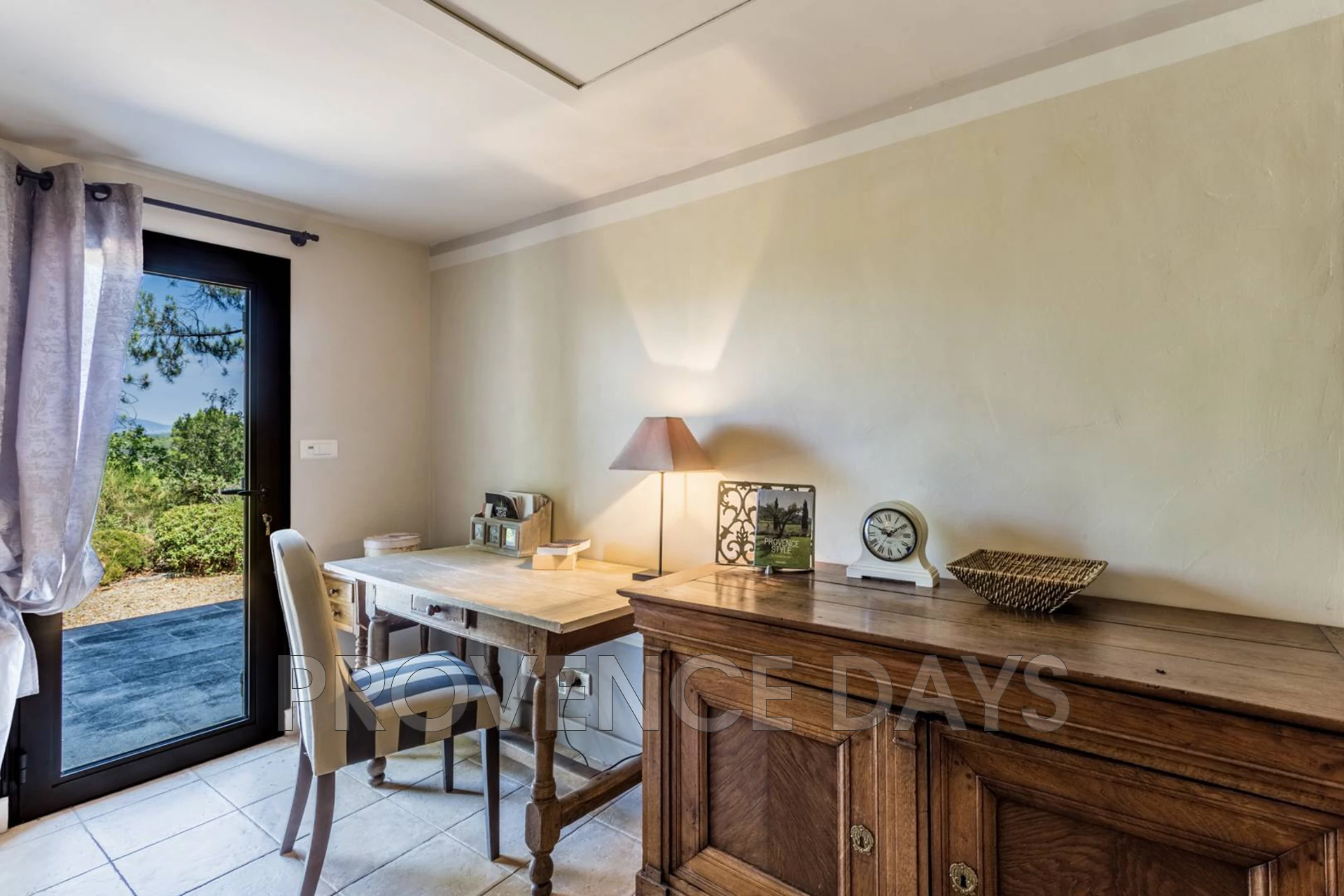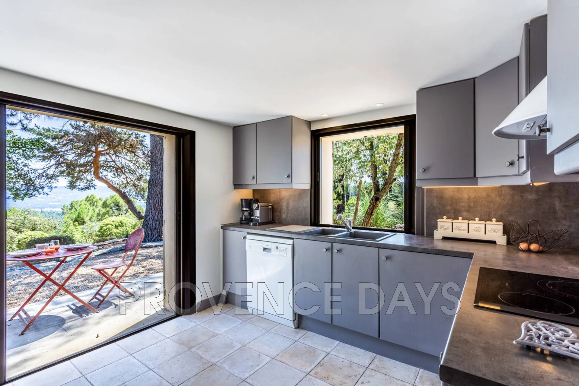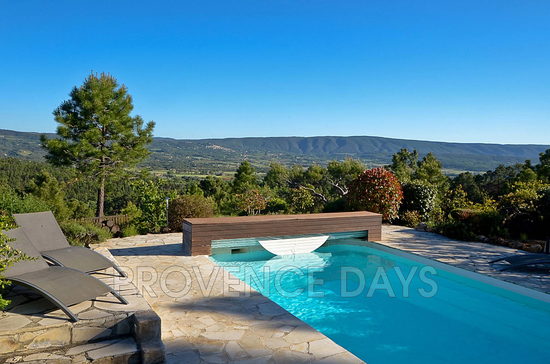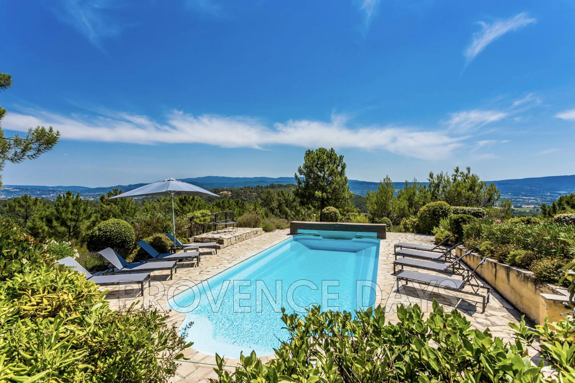 Villa Roussillon is a stylish single-storey villa for eight, offering breathtaking sunrise-to-sunset views, a heated pool, and seamless indoor-outdoor living. - Inside - The villa features air-conditioned bedrooms arranged to either side of a spacious central living and dining area, where wide sliding doors disappear into the walls to merge the inside and outside spaces. Living Room: A big space with leather sofas around a fireplace and TV/DVD in one half of the room, and the dining table in the other half. There are both French and English-language channels on the TV, and high-speed WiFi internet. Kitchen: Equipped with oven, 4-ring stove, fridge-freezer, dishwasher, microwave, filter coffee machine, and Nespresso. The kitchen also opens onto the south-facing terrace. Laundry Room: With washing machine, tumble dryer and a second fridge-freezer. Study: Writing desk and day-bed, next to the master bedroom. Guest WC - Bedrooms - Villa Roussillon sleeps 8 people with 4 air-conditioned double bedrooms and 3 bathrooms, all on the ground floor, and each bedroom has its own TV/DVD with satellite channels. Master Bedroom: Opening onto the main terrace, the master bedroom has a 1.8m/6ft-wide bed. The en suite bathroom has bath with handheld shower, double basins and toilet. Bedroom 2: With a 1.6m/5.25ft-wide bed. En suite bathroom with a shower and basin, and a separate toilet. Bedroom 3: With 1.4m/4.6ft-wide bed and shared connected bathroom with bedroom 4, with shower, basin and toilet. Bedroom 4: Sharing the third bathroom with bedroom 3, bedroom 4 has a 1.4m/4.6ft-wide bed. - Outside - From the terrace, garden and pool there is a fabulous view to the south. The hilltop villages of Bonnieux and Lacoste are framed against the backdrop of the Luberon mountain. There are 3 acres (1.25ha) of garden with terrace, pool area and pine trees. The pool is heated from May to October and measures 10m x 4.2m (33ft x 14ft). The pool has a sliding rigid cover for security, roman steps at one end and safety step along the sides. Around the pool are sun loungers and parasols, and of course that view. Outdoor dining can be on the terrace under an awning, or in the garden under the shade of the pergola alongside the bbq. Secure parking is to the rear of the house, and the entrance to the property is gated.